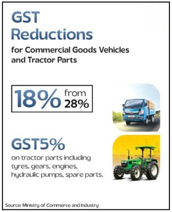 9. Components used in tractor manufacturing, including tyres and gears, are now taxed at 5%, supporting ancillary industries producing engines, hydraulic pumps, spare parts, and export-oriented manufacturing growth globally.