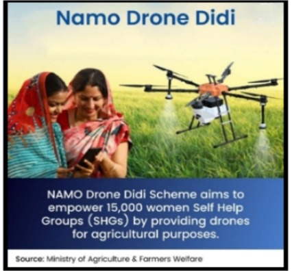 4. The Namo Drone Didi scheme, launched in November 2023, aimed to provide drones to women Self Help Groups for precision farming, higher productivity, lower input costs, and livelihoods.