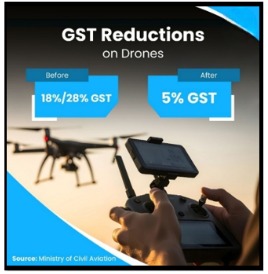10. GST on drones was reduced to a uniform 5 percent in September 2025, replacing earlier 18 percent and 28 percent rates, and lowering costs for drone adoption.