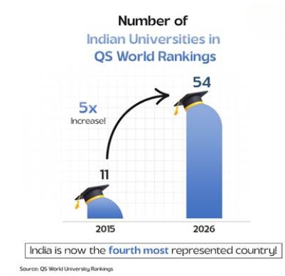 - A five-fold increase took India from 11 universities in 2015 to 54 in the QS World Rankings 2026.