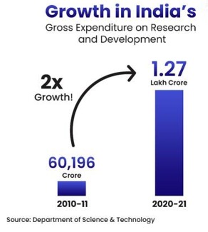 • India’s expenditure on R&D rose from ₹60,196 crore in 2010–11 to ₹1.27 lakh crorein 2020–21.