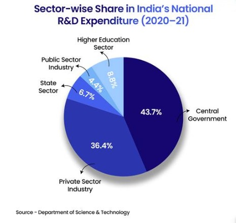 3. The government sector contributes about 64 percent of India’s Gross Expenditure on Research and Development, while the private sector accounts for nearly 36 percent.