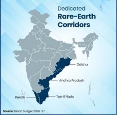 • Union Budget 2026–27 announces Dedicated Rare Earth Corridors in Odisha, Kerala, Andhra Pradesh, and Tamil Nadu for mining, processing, research, and manufacturing of Rare Earth Permanent Magnets (REPMs).