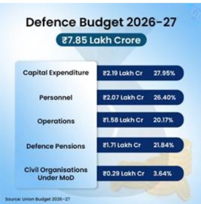 1. In FY 2026–27, the defence allocation of ₹7.85 lakh crore is: