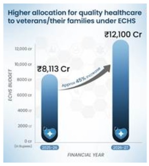 15. ECHS gets ₹12,100 crore in FY 2026–27, 45.49% above FY 2025–26 BE; defence pensions exceed ₹1.71 lakh crore, serving 34+ lakh pensioners via SPARSH, and authorised agencies nationwide.